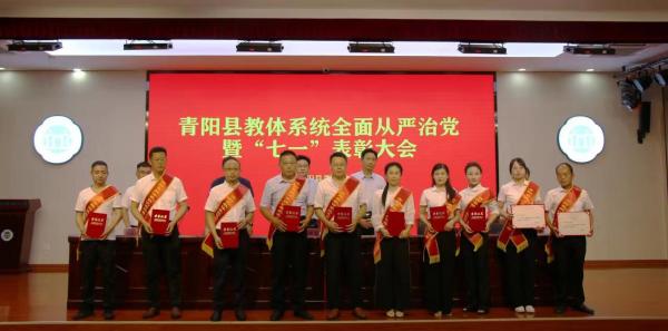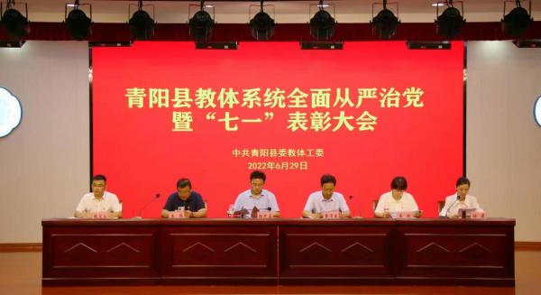 为认真贯彻落实中央及省委、市委、县委全面从严治党决策部署要求,压紧压实学校党组织主体责任,6月29日上午,青阳县教体系统召开全面从严治党暨“七一”表彰大会。县委教体工委书记、县教体局局长杨忠喜出席会议并上党课。县委教体工委班子成员,派驻综合纪检组负责同志,各基层学校党组织书记、校(园)长,受表彰对象,新发展党员代表及教体局机关党员干部参加会议。