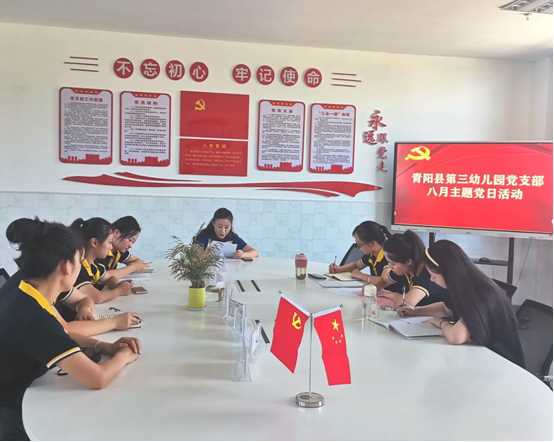 8月12日上午,青阳县第三幼儿园党支部开展了八月份主题党日活动,会议由党支部书记主持,全体党员、积极分子以及入党申请人参加活动。